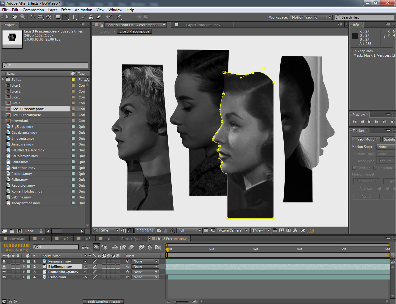 About three hundred films of different genres from productions of Hollywood blockbusters, artistic anthology films to Bollywood films were reviewed. From the eighty selected films, certain sequences were singled out in duration of five to ten seconds where actresses are seen in close-up, turned their head to the left or right side, and thirty-nine sequences were used in realization of this project. The genres that suited the needs the best to this project had scenes with a slow head turn preceded by a long break.