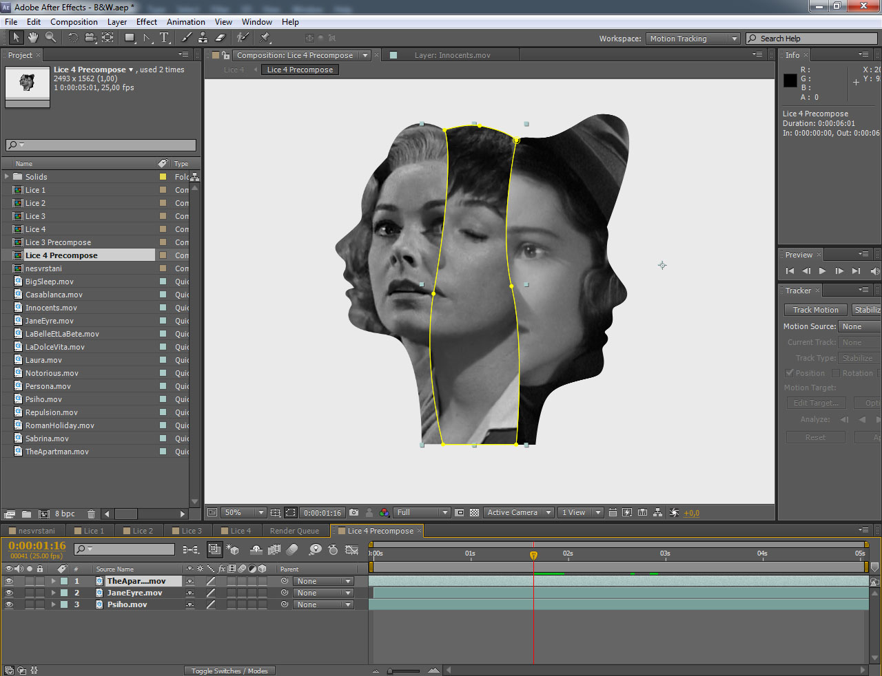 Pregledano je oko tri stotine filmova razlicitih zanrova i produkcija od holivudskih blokbastera, umetnickih antologijskih filmova do bolivudskih filmova. Iz osamdeset izabranih filmova izdvojene su odgovarajuće sekvence u trajanju od pet do deset sekundi u kojima su glumice, prikazane u krupnom planu, okretale glavu na levu ili desnu stranu, a trideset devet sekvenci je iskorišćeno u realizaciji projekta. Zanrovi koji su najviše odgovarali potrebama ovoga projekta imali su scene sa sporim okretom glave kome su prethodile duge pauze.